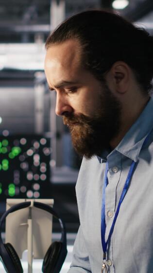 Vertical Employee requesting help from manager to fix hacked equipment systems. Stressed data center admin reacting to spyware popup on computer screen, launching emergency response protocol, camera A Pro Video