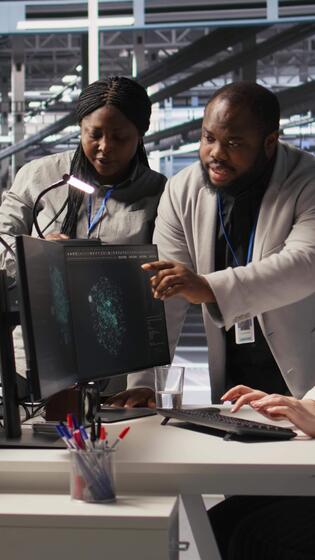 Vertical Engineering team in data center using AI automation during maintenance session. Server hub coworkers doing brainstorming, configuring deep learning models in hardware rigs, camera A Pro Video