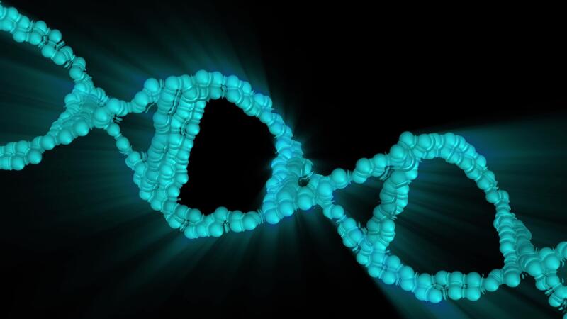A close-up of the DNA double helix structure, highlighted in blue on a black background, showing its twisted ladder-like structure in looping motion. Pro Video