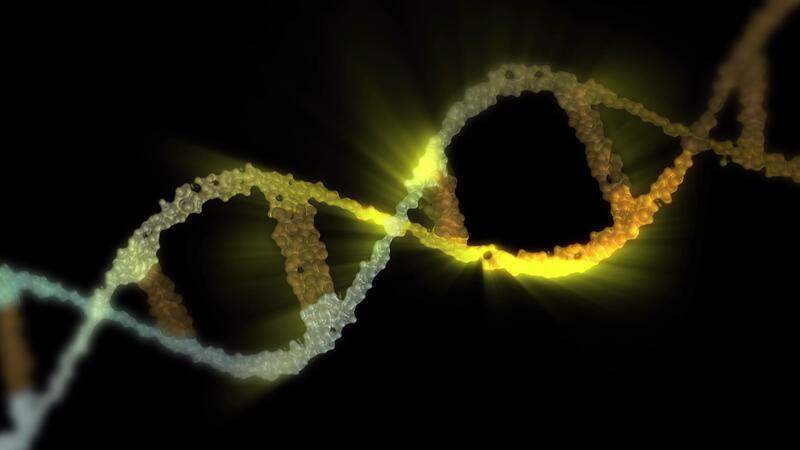 A close-up of the DNA double helix structure, in gold, showing its twisted ladder-like structure in looping motion. Pro Video