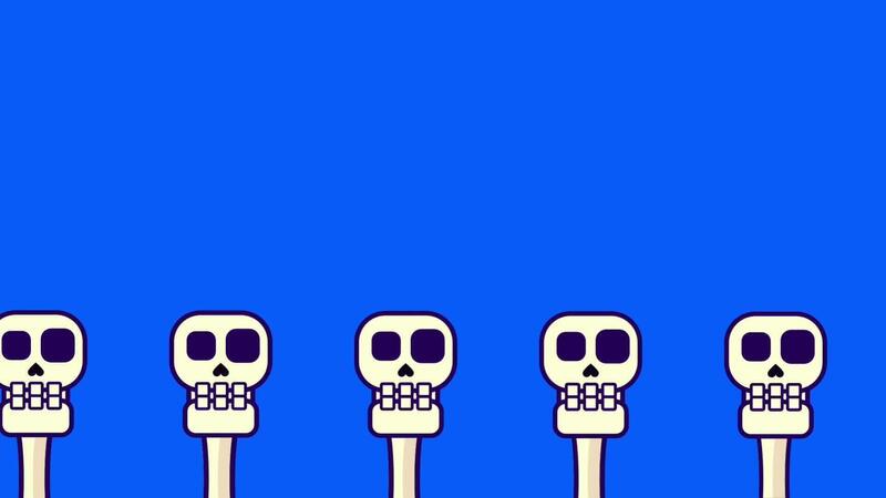 Four skull figures appear walking in line across a blue screen, representing unity, movement, and a playful march sequence Free Video
