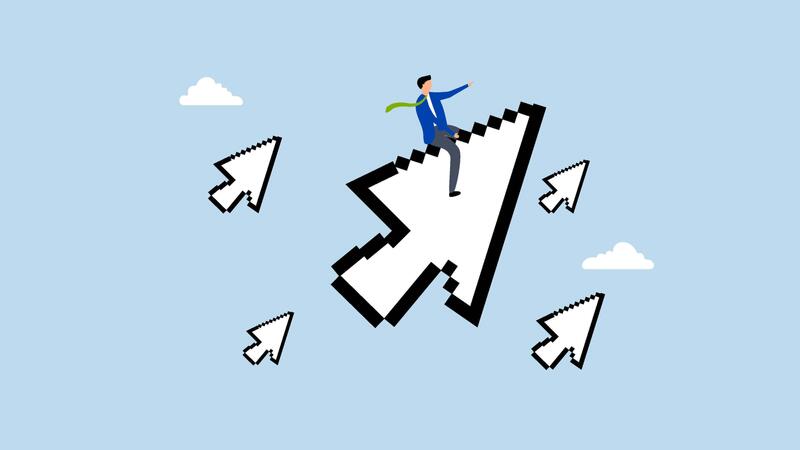 digital marketing, 4k animation of businessman riding digital pixel mouse pointer to click on button. Pro Video