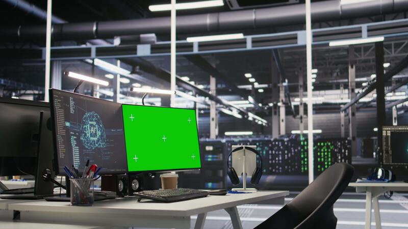 Server farm mockup computer used for visualizing artificial intelligence workloads and overseeing equipment. Isolated screen PC supporting machine learning systems, simulated computing tasks Pro Video