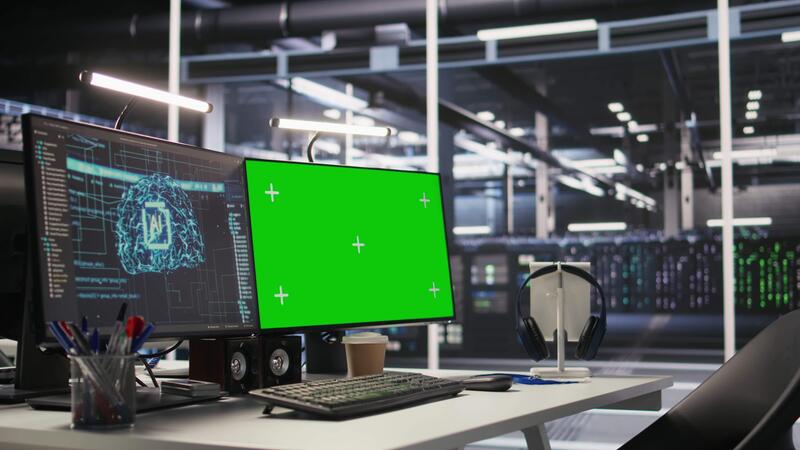 Mockup computer in high tech data center office used for AI system monitoring and performance tracking. Green screen PC overseeing server rigs involved in computing operations Pro Video