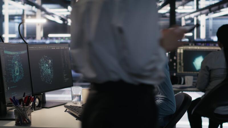 Data center system administrator talking with coworker in office while doing software updates. Server room IT expert and colleague chatting, optimizing infrastructure rackmounts configuration, camera A Pro Video