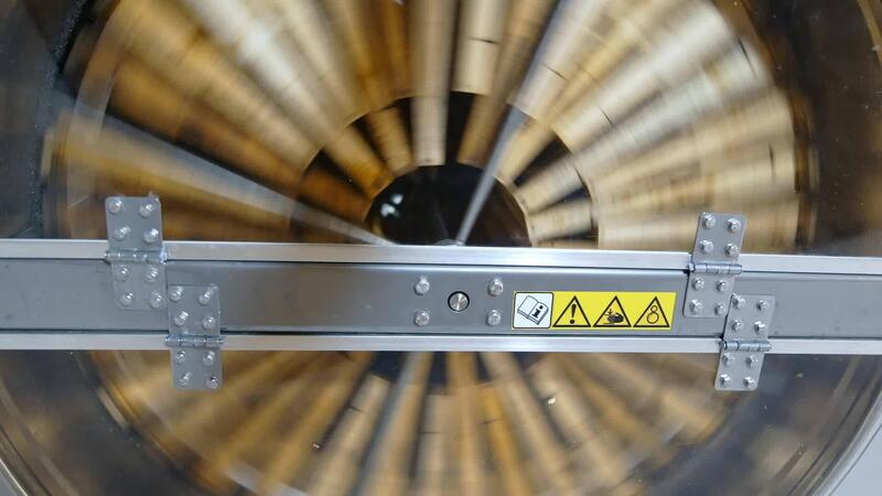 Spinning of honey extractor. Removal of honey from the honeycomb in special device. Centrifuge machine is pumping organic honey while spinning with frames with honeycombs. Top view. Pro Video