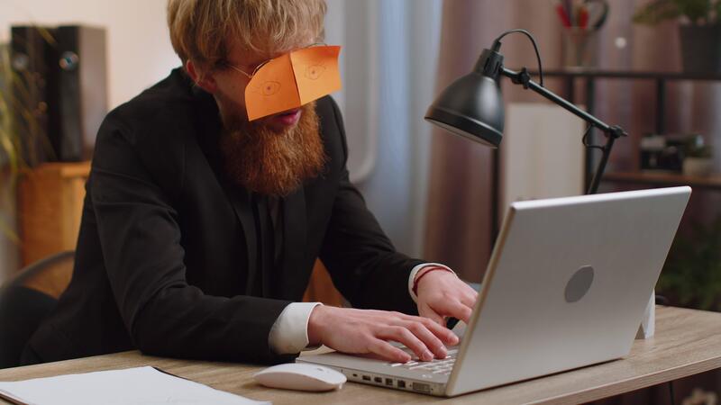 Tired inefficient lazy business man working sleeping on laptop computer with eyes stickers on face Pro Video