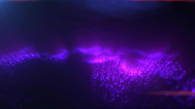 Vibrant digital particle grid with purple light beams and floating points, simulating a 3D data network Free Video