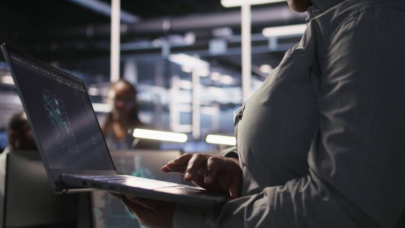 Close up of data center engineer using laptop to monitor neural network AI LLM visualization. Worker using notebook to oversee servers powering machine learning processes, camera A Pro Video