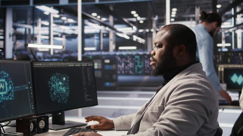 Satisfied data center employee finishing system maintenance on supercomputers. Smiling technician pleased by successful AI model training results on PC while overseeing server infrastructure, camera A Pro Video