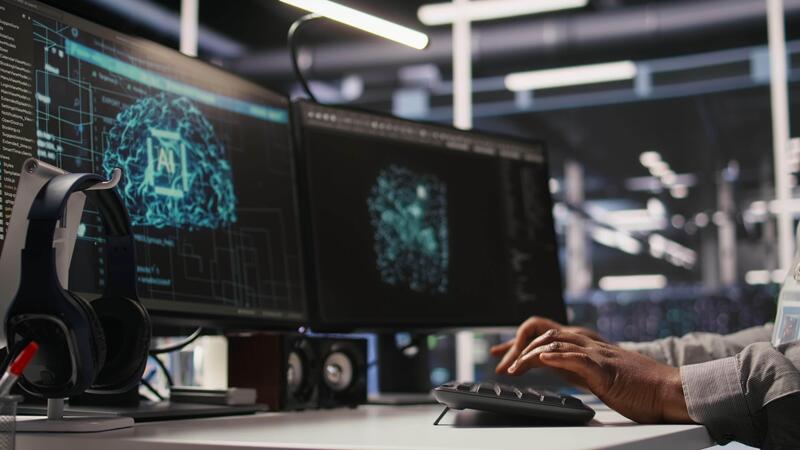 Close up of data center admin coding, writing script on PC identifying bottlenecks. Server farm IT expert typing on computer keyboard, troubleshooting bugs, implementing optimizations, camera A Pro Video