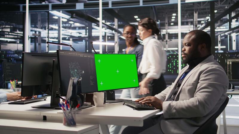 Data center admin inspecting gear using green screen mockup PC, doing maintenance tasks. African american server farm worker using chroma key computer, conducting system checks, camera A Pro Video