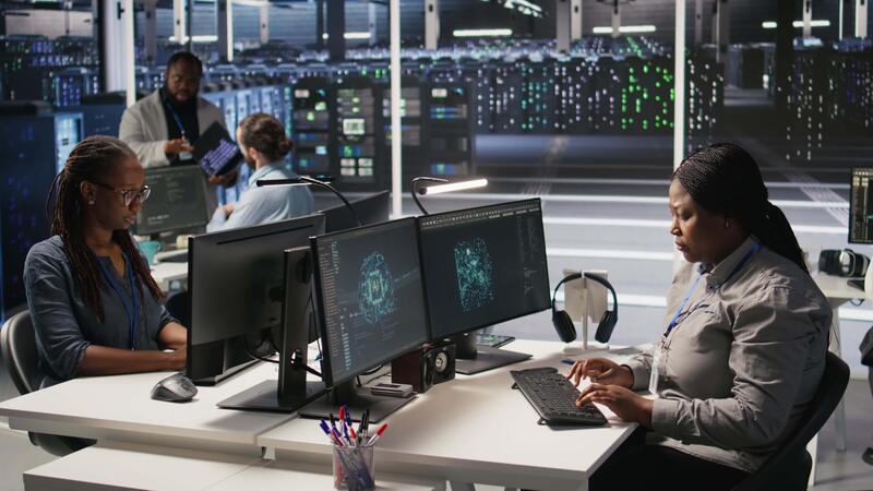 Data center system administrator using PC to monitor neural network AI visualization. African american woman in server room using computer to oversee rigs powering machine learning processes, camera A Pro Video