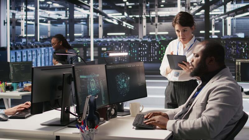 Server room manager supervise technician examining deep learning algorithms. Data center team leader and African american employee review performance dashboards of AI equipment rigs, camera A Pro Video