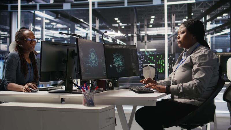 Data center developer coding on PC, doing software updates for AI supercomputers, looking at watch. Server farm IT professional optimizing infrastructure using artificial intelligence, camera A Pro Video