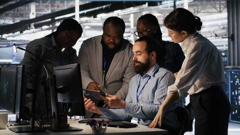 Data center system administrators performing maintenance on supercomputers used for AI processing. Team managing server hub rigs used for deep learning training, looking over business charts, camera A Pro Video
