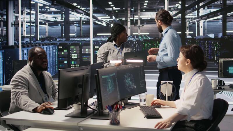 Data center engineers performing maintenance on blade server units used for artificial intelligence processing. IT professionals manage data center arrays used for machine learning training, camera A Pro Video