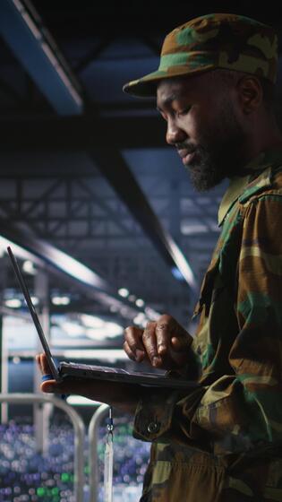 Vertical Army technician in command center server room using laptop to install and maintain IT systems. Military data center admin overseeing computer networks and information systems, camera A Pro Video