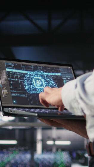 Vertical Close up of IT specialist in server room doing AI deep learning automatization. Data center software developer using notebook, doing hardware maintenance using AI, camera A Pro Video