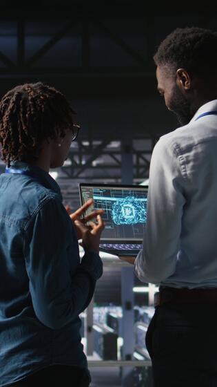 Vertical Data center engineering team doing maintenance on rigs handling AI processing tasks. Server hub teamworking colleagues managing storage arrays supporting deep learning training workflows, camera A Pro Video