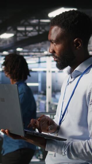 Vertical Server hub IT professional managing storage arrays supporting deep learning training workflows. Engineer on industrial platform performing maintenance on servers handling AI processing tasks, camera A Pro Video