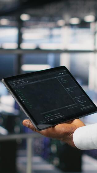 Vertical Close up of data center admin using tablet to reviewing machine learning code dashboards. Server farm IT expert using device to monitor AI infrastructure performance, camera B Pro Video