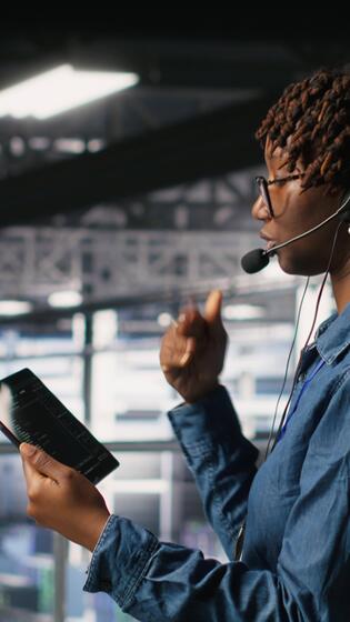 Vertical Server hub IT expert monitors systems, doing tech support, guiding users through troubleshooting steps. African american technician providing remote diagnostics using headset mic, camera B Pro Video