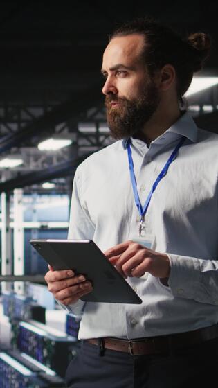 Vertical Server room technician next to coworkers reviewing neural network code and LLM visualization dashboards. Data center IT specialist next to colleagues monitoring AI system performance, camera A Pro Video