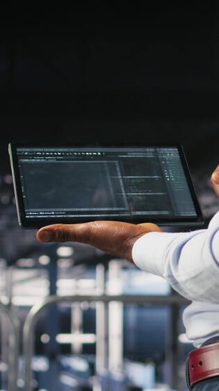 Vertical Close up of programmer swiping on tablet display in data center, doing maintenance tasks, ensuring optimal performance. IT expert checks code on device, applying patches to improve stability, camera A Pro Video