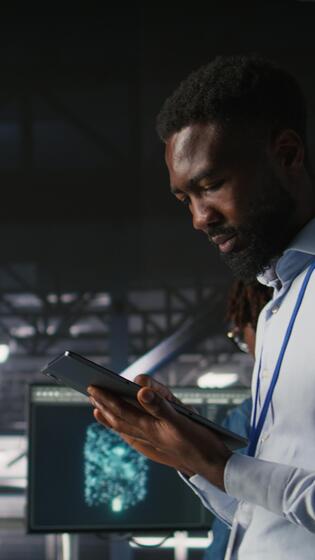 Vertical Engineer walking on data center industrial platform, performing system maintenance. IT professional using tablet to do upgrades, resolving bugs and enhancing infrastructure stability, camera A Pro Video