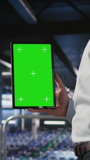 Vertical Close up of data center admin using mockup tablet to update storage arrays software, configuring network virtualization. Server room IT expert using chroma key device to verify settings, camera A Pro Video