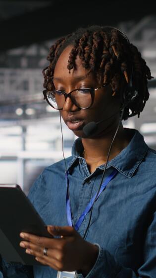 Vertical Server room admin using tablet and headset microphone to provide infrastructure tech support. Data center IT specialist resolves backend issues while coordinating with remote teams, camera B Pro Video
