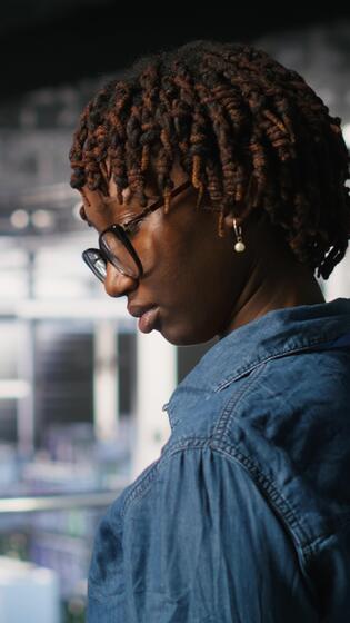 Vertical Data center coworkers doing maintenance on mainframes handling AI processing tasks. Server hub system administrators managing storage arrays supporting deep learning training workflows, camera B Pro Video