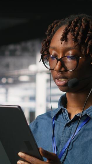 Vertical Data center engineer wearing headset microphone providing remote diagnostics using tablet. Technician monitors system health and guides users through infrastructure troubleshooting steps, camera B Pro Video