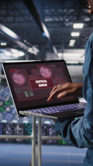 Vertical Technician in data center stressed by critical error popup on laptop during diagnostics session. Anxious IT specialist troubleshooting system fault affecting infrastructure performance, camera A Pro Video