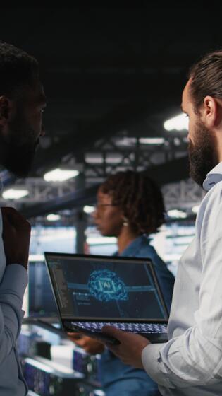 Vertical Server farm coworkers doing infrastructure AI machine learning automatization. Data center computer scientists collaborating to maintain servers using artificial intelligence, camera A Pro Video