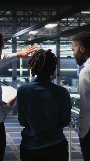 Vertical Data center manager talking with workers performing maintenance on supercomputers used for AI. Server hub team leader and staff members upgrading rigs used for deep learning training, camera A Pro Video