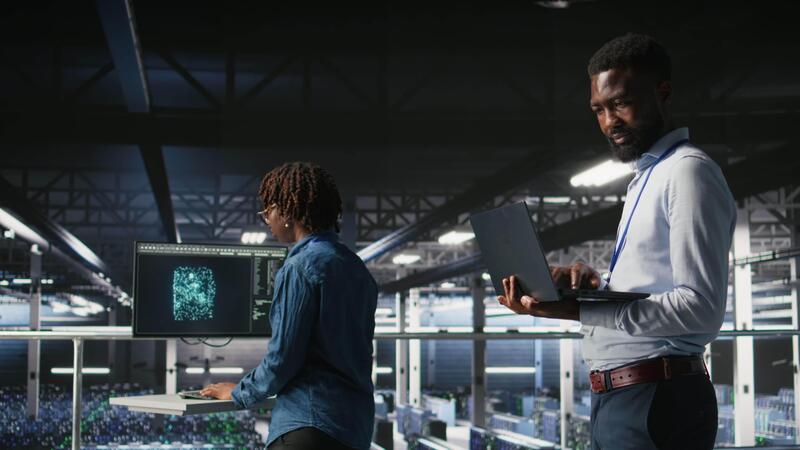 Smiling data center engineering team on industrial platform collaborating on neural network software tasks. Jolly server hub colleagues working together, visualizing large language model architecture Pro Video