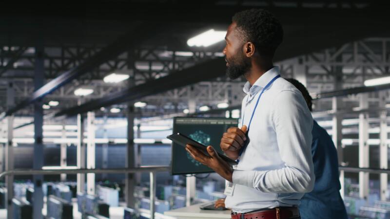 Technician walks in data center, doing maintenance tasks on tablet, ensuring optimal performance. IT expert reviewing diagnostics and applying patches to server hub gear, improving stability, camera B Pro Video