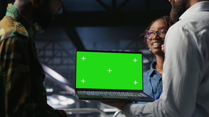 Military command center engineering team using chroma key notebook. Army IT expert and coworkers in data center using green screen laptop to defend networks against threats, camera B Pro Video