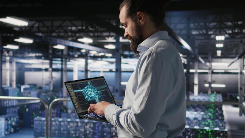 Technician holding laptop walking on server farm platform, doing AI machine learning automatization. Data center programmer using notebook, doing maintenance using artificial intelligence, camera A Pro Video