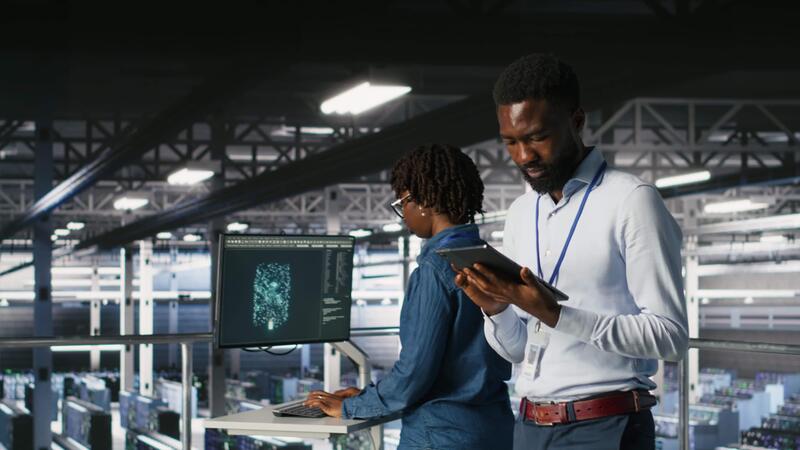 Engineer walking on data center industrial platform, performing system maintenance. IT professional using tablet to do upgrades, resolving bugs and enhancing infrastructure stability, camera B Pro Video
