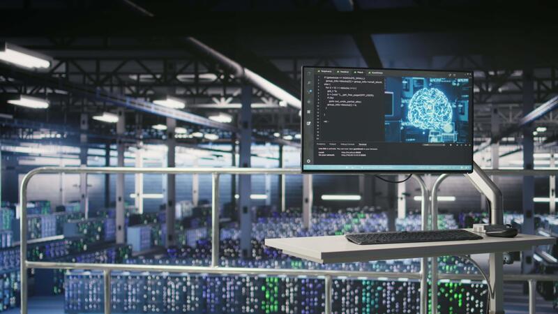 Server hub computer screen monitoring systems processing machine learning datasets for AI workflows. PC displays tracking hardware supporting artificial intelligence model development Pro Video