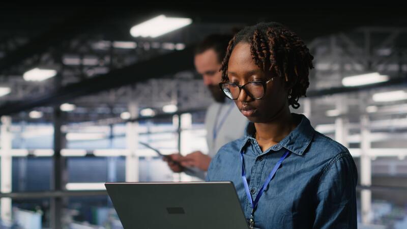 Happy woman in data center doing maintenance tasks on laptop, ensuring optimal performance. Engineering team reviewing diagnostics and applying patches to server room, improving stability, camera B Pro Video