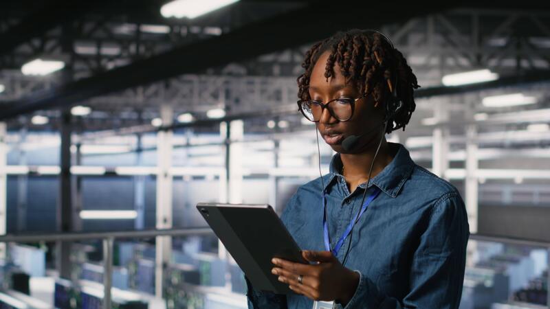 Server room admin using tablet and headset microphone to provide infrastructure tech support. Data center IT specialist resolves backend issues while coordinating with remote teams, camera B Pro Video