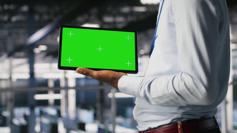 Close up of server farm developer using isolated screen tablet, reviewing AI LLM visualization. Data center IT specialist using mockup device to monitor deep learning systems, camera B Pro Video
