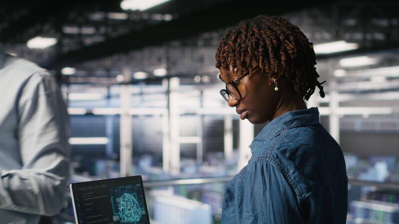 Data center coworkers doing maintenance on mainframes handling AI processing tasks. Server hub system administrators managing storage arrays supporting deep learning training workflows, camera B Pro Video