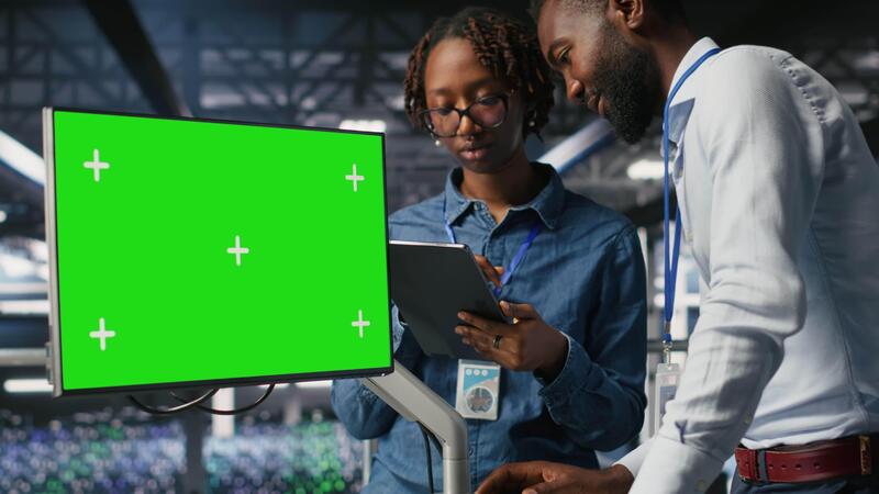 Data center colleagues working on green screen PC, updating storage infrastructure. IT engineering team using mockup computer in server hub workspace filled with networking tech, camera B Pro Video