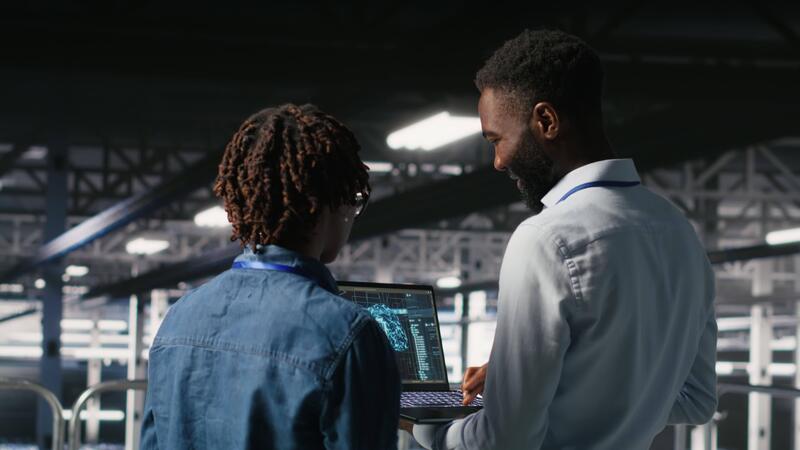 Data center engineering team doing maintenance on rigs handling AI processing tasks. Server hub teamworking colleagues managing storage arrays supporting deep learning training workflows, camera B Pro Video