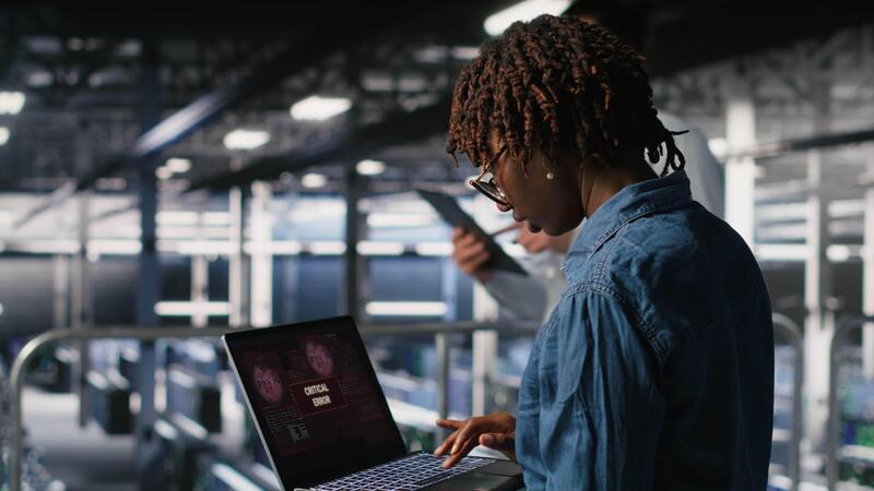 Technician in data center stressed by critical error popup on laptop during diagnostics session. Anxious IT specialist troubleshooting system fault affecting infrastructure performance, camera B Pro Video